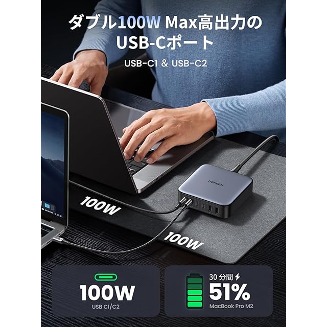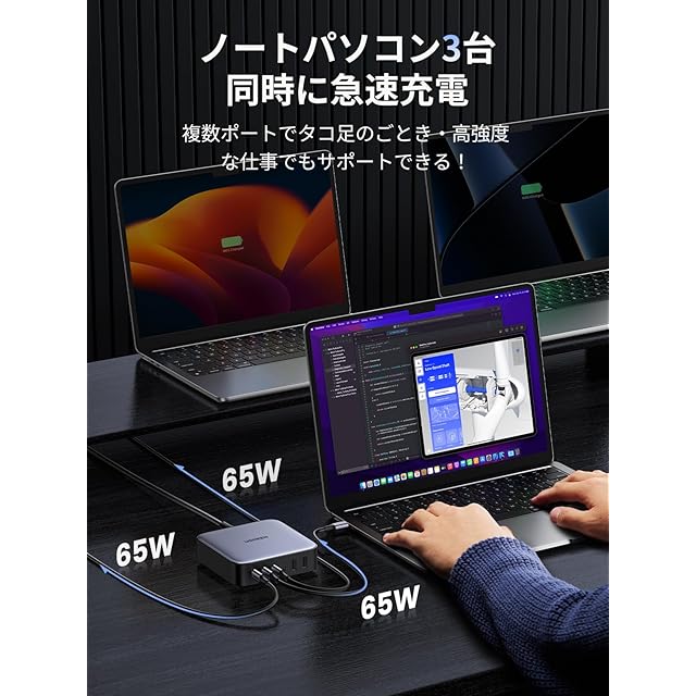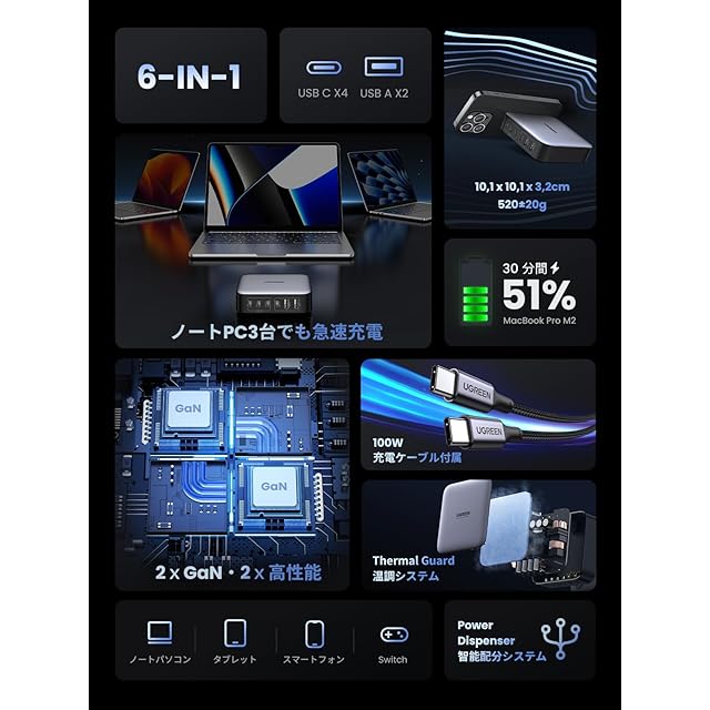 【全てのタイプC ポートはPD充電対応!6つのデバイスを同時に】進化されたGaN III世代技術を採用して、全てのタイプCポートはPD3.0急速充電に対応出来ます。小型化に成功しながら超高出力を実現して、三台のパソコンを同時に65Wのパワーで充電することを可能にします。スマホやタップレト、スイッチはもちろん、単ポート100Wまでの出力パワーにおいて、MacBook Pro 16インチを90分間で0%-100%充電出来て電源切れの心配はありません .