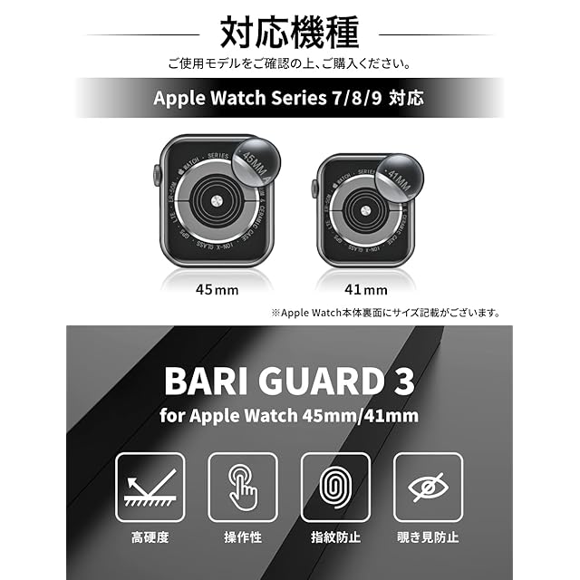 対応機種| 「41mm」Apple Watch Series 9 アップル ウォッチシリーズ9 41mm /Apple Watch Series 8 アップル ウォッチシリーズ8 41mm / Apple Watch Series 7 アップル ウォッチシリーズ7 41mm 対応するサイズをお選びください。ご使用モデルのサイズはApple Watch本体裏面に刻印がございます。ご確認の上お買い求めください。適合するサイズ以外のものと使用された場合、操作不良やガタつき、割れなどの原因となりますのでご注意ください。BARI GUARD 3 for Apple Watch(バリガード3)はあなたの素敵なApple Watchを保護し、Apple Watchライフをサポートします。