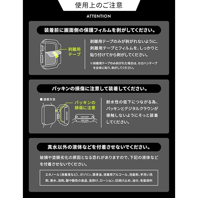 機能性 ▏ 正確なカットアウトの保護ケースでアップルウォッチの各ボタンの操作はアップルウォッチ本来の操作感に近く、快適に操作できます。 アップルウォッチ裏のセンサー部分にカバーがない設計なので、保護ケースを装着したままでの充電が可能です。 また、バンド部分に干渉しないカバーデザインでバンドの交換もスムーズにおこなえます。ガラス面には、グレア現象(密着痕)を防止するドット加工を施しております。(100%防ぐものではありません) 腕に着けたままかぶせるだけ。従来の保護ケース同様に何度でも着脱可能。強化ガラスを使用しておりますが、一点に負荷がかかると破損することがあります。特に脱着時、ガラス面を押さえないようご注意ください。保護ケースガラス内側はドット加工が施されている為、お手入れの時など摩耗により傷がつく場合があります。香水、溶剤、洗剤、酸や酸性の食品、虫除け、ローション、日焼け止め、油分、毛髪染料などは本製品及びAppleWatchに悪影響を及ぼす可能性がありますので付着しないようにしてください。