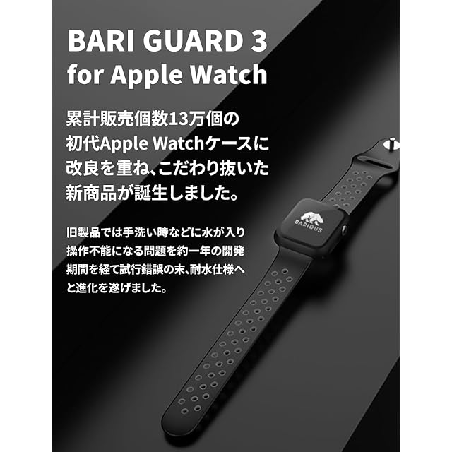BARIOUS BARI GUARD 3 for Apple Watch(バリガード3)に覗き見防止機能がさらに追加! アップルウォッチ用保護ケースBARI GUARD 3は、機動隊の特殊な盾にも使用される程の強度を誇るPC素材により耐久性に優れ、側面からの擦り傷、衝撃を有効的に防止し、アップルウォッチを保護します。 バンパーだけでなく液晶部に硬度9Hの強化ガラスを採用したフルカバータイプの保護ケースとなっていますので、アップルウォッチ本体の液晶画面への傷や衝撃を緩和し、大切なApple Watchをしっかりと保護します。 アップルウォッチすべての側面を完全に覆い保護しながら、アップルウォッチをいつまでも綺麗に保ちます。