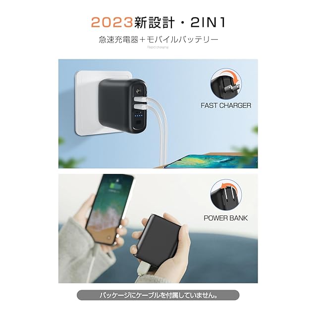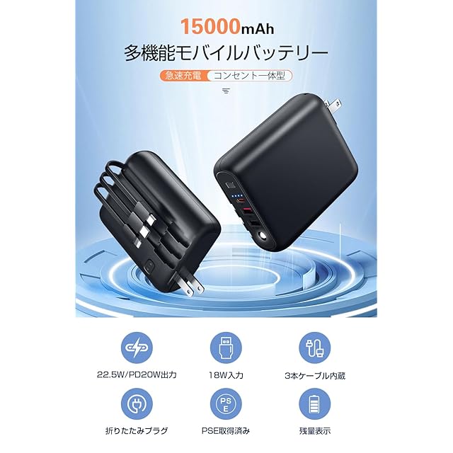 商品名:【2025新登場 & 15000mAh大容量 & 3本ケーブル内蔵】 モバイルバッテリー 大容量 (コンセント一体型/22.5W/PD20W 急速充電/6台同時充電) モバイル・バッテリー 軽量 小型 携帯充電器 iPhone/iPad/Android対応 折りたたみ式プラグ 残量表示 ライト付き Type-C入/出力ポート 二つUSBポート PSE技術基準適合