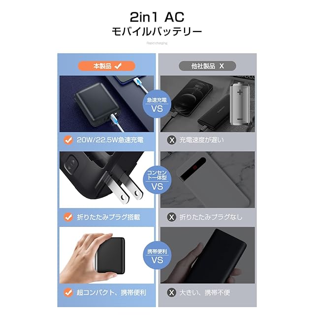 従来のモバイルバッテリー 、充電器は単機能で、本製品はACアダプタ搭載で、モバイルバッテリーと急速充電器の2役をこなせるのが最大の魅力といえるでしょう。製品をコンセントに差し込めば、急速充電器として使用、コンセントから抜けばの時、15000mAhのモバイルバッテリーに1秒で早変わります。航空機内への持ち込みも可能です。出張/旅行/アウトドア/キャンプ/停電対策/防災グッズに最適です。