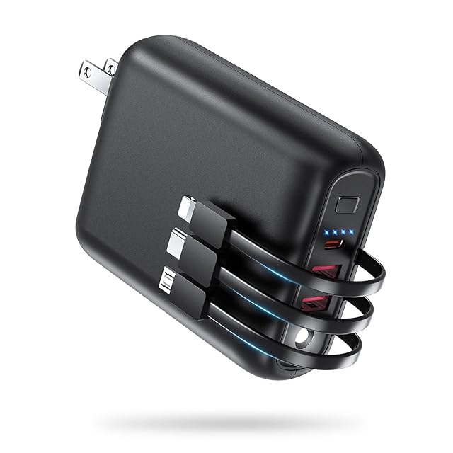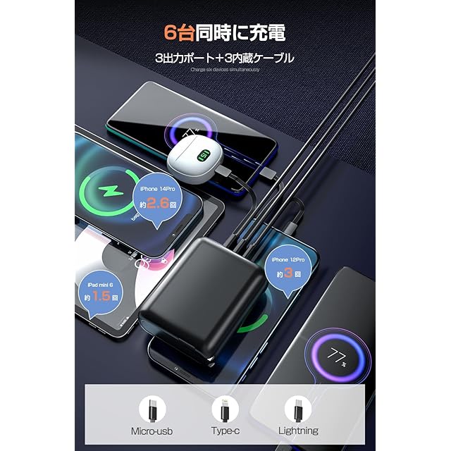 【3本ケーブル内蔵 & 6台同時充電可能】USB、Type-C、iPhone用の3本出力ケーブルを内蔵しており、旅行先などでケーブルを忘れる心配がありません。USB-C入/出力ポートと2つのUSBポートを合わせて、複数の端末を同時に充電できます。コンセントに差し込んだ状態でもスマホを接続することができ、通常の充電器と同じように使用可能です。最大6台まで同時充電が可能です。