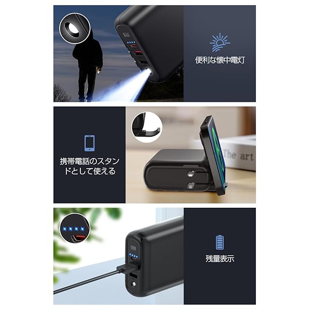 【残量表示・ライト機能・携帯スタンド付き】LEDの残量表示と明るいライトが装備され、電源ボタンを押すだけでバッテリーの残量や入出力状況が一目で確認できます。また、ライトは懐中電灯としても使え、非常時にも役立ちます。このスマホ充電器には携帯スタンドもついており、引き出すだけでスマホを安定させることができます。動画視聴しながら充電することも可能です。