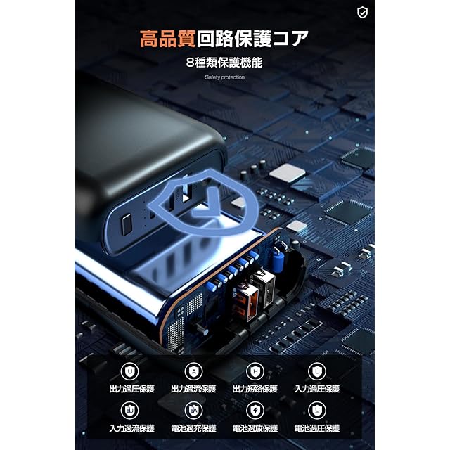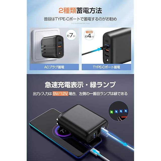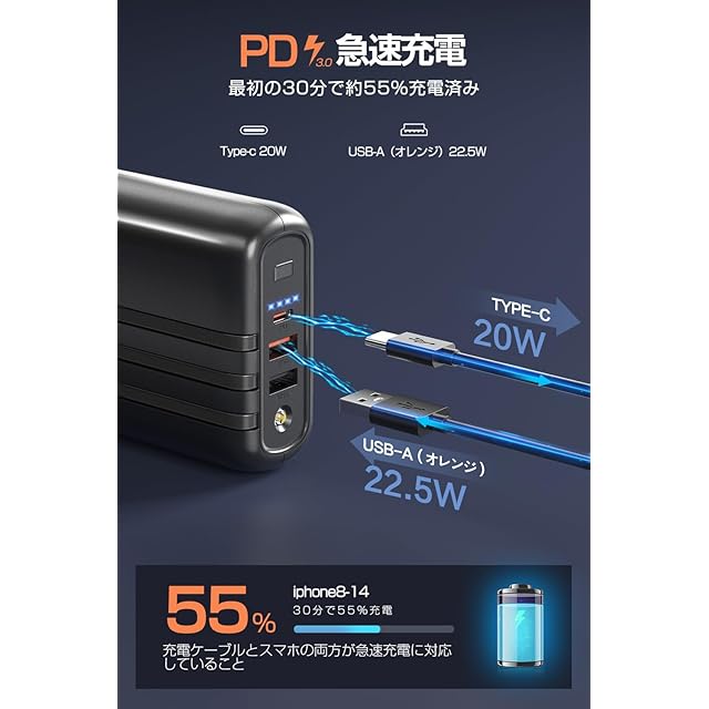 【22.5W/PD20W対応急速充電バッテリー】Type-Cポート最大出力20W(入力18W)、USB-Aポート(オレンジ)最大出力22.5W、内蔵Type-Cケーブルも最大出力22.5Wをサポートしております。Type-CポートからiPhone 14を30分で55%まで急速充電可能、スマホの電池を素早く回復。注意:急速充電にはデバイスとケーブルが対応していることが必要。※出力/入力は9V/12V場合,(残量表示ランプ)左側の一番目ランプは緑である。