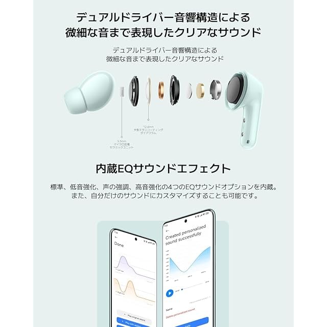 【デュアルドライバー、微細な音まで表現】アップグレードした12.4mmの大型ドライバーと5.5mmのツイーターを搭載したデュアルドライバーシステムを採用。それぞれの音域を分担することで、低音の迫力と高音の伸びやかさを両立させ、よりバランスの取れたサウンドを実現。さらに、映画やTVの視聴に最適な3Dオーディオを搭載し、まるでその場にいるかのようなリアルなオーディオ体験を提供します。