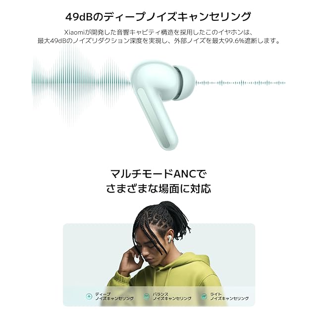 【最大49dB /2kHzに対応したアクティブノイズキャンセリング】家電の動作音や雨の音、キーボードのタイピングなど最大49dB /2kHzのノイズを99.6%削減するアクティブノイズキャンセリングを搭載。アクティブノイズキャンセリングは3つのモード(ライトモード、バランスモード、ディープモード)から選択が可能です。