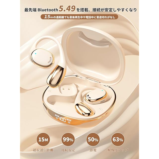 商品名:ワイヤレスイヤホン【2025年業界高水準 オープンイヤーイヤホン】業界トップ Hi-Fi音質Bluetooth5.49 瞬時接続 ブルートゥースイヤホン 最大60時間再生 骨伝導イヤホンの革新 耳掛け式 耳を塞がない 空気伝導earphone マイク付き Type-C急速充電 超軽量 LED ディスプレイ残量表示 両耳 片耳 IPX7防水 通勤/スポーツ (アイボリー)