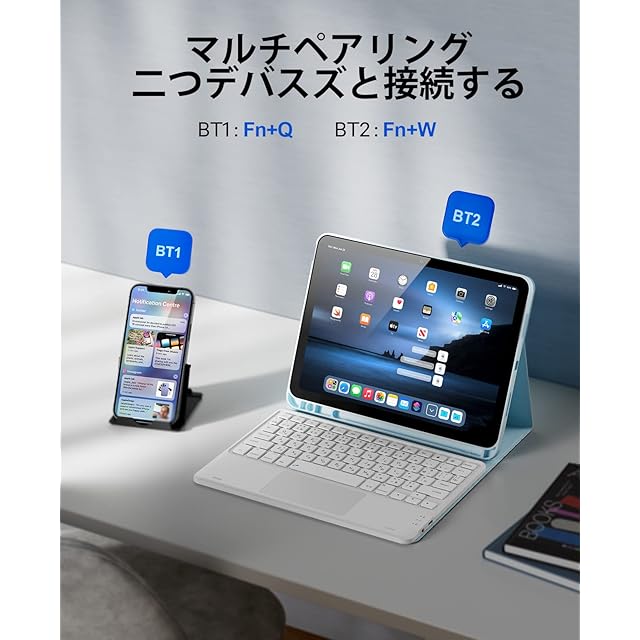 【Bluetooth5.1&マルチペアリング2台切り替え】ipad 10世代キーボードケースはBluetooth5.1機能を搭載し、10メートル以内の伝送範囲で、データ転送速度と安定性も大幅アップすることが楽しめます。二つBluetoothチャネルがあるので、1台マルチペアリングキーボードでiPadやiPhone、ボタンを押すだけで自由に切り替えることができます。(Bluetooth接続のみをサポートします。)