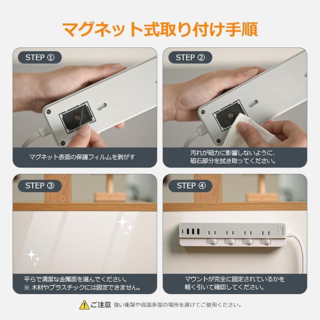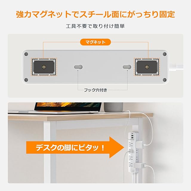 【マグネット 電源タップ・壁掛け】この電源タップは強力なマグネットを備え、デスク周りやスチール家具など鉄製の場所にしっかり吸着し、空いたスペースで作業や掃除がしやすくなります。ACコンセントを8口すべて使用しても落下しにくい設計です。特別な設置作業は不要で、簡単に取り付け可能です。そして、鉄製以外の場所で使用しても全く問題ありません!2つの壁掛け用フック穴が追加されましたので、金属面や壁など、どこにでも使用可能で、机や床のスペースを取らずに好きな場所で電源を確保できます。