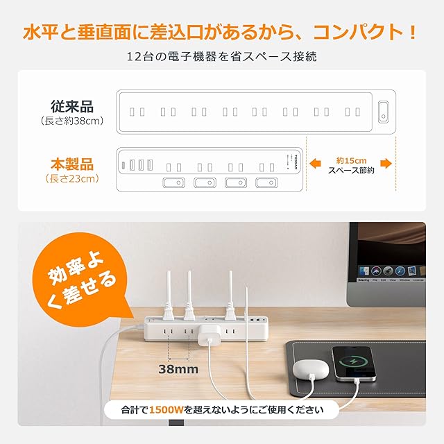 【一台12役・延長コードUSB付き】1つのUSB-Cポート、3つのUSB-Aポートと8つのAC差込口を搭載したマルチタップです。ACコンセントで複数の家電を接続しながら、USBポートでお使いのUSB機器を充電できます。自宅やオフィスで複数の電子機器を充電したい場合、最大 12 台の機器を同時に充電できるこのusb電源タップが、あなたのニーズに完璧に応えます。