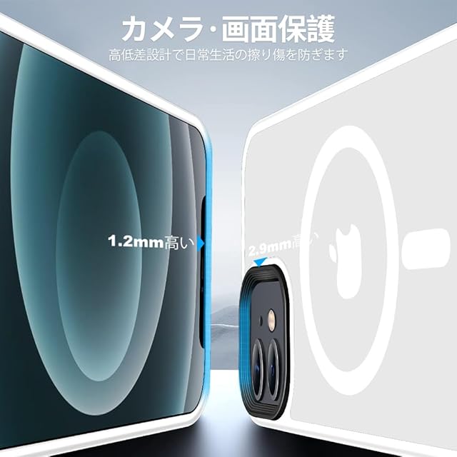 アイホン12/12 Proの曲線に従って高低差を設計。液晶画面より1.2mm高く、カメラレンズより2.9mm高く、机などの平面に置いても傷付く心配はない。※本製品は6.1インチしか対応できないですから、ご購入する前サイズを確認ください。