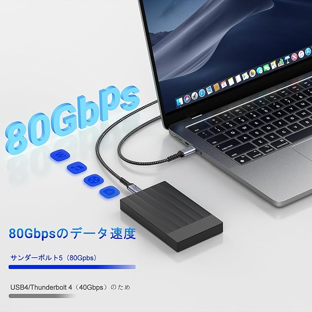 [80 Gbpsデータ伝送]:第4世代ケーブルは80 Gbps高速データ伝送を提供し、数秒以内に音楽、映画、テレビ番組を伝送する。USB 4.0、USB 3.2、USB 3.1、USB 3.0、USB 2.0と後方互換性があります(注意:デバイスも80 Gbpsに対応していることを確認してください)