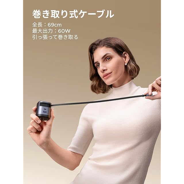 商品名:UGREEN 65W 充電器 【69CM 巻き取り式】 8階段調整可能 伸縮式 Type-C ケーブル内蔵 USB-C/USB-A 3ポート同時充電可能 PD3.0 旅行/出張/収納/スマホ/パソコン/タップレットなどType-C適合