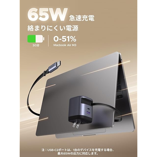 ▶【単一ポートで65W Max高出力& 3ポート同時対応】 MacBook Air M4をわずか60分で84%まで充電! 1ポートなら最大65Wのフルパワー集中、2ポート/3ポート同時使用時は自動で最適分配を実現。PD3.0/QC4+対応、スマートフォンからタブレット、ゲーム機からノートパソコンまであらゆる USB-C 関連機器を効率よく急速充電できます。