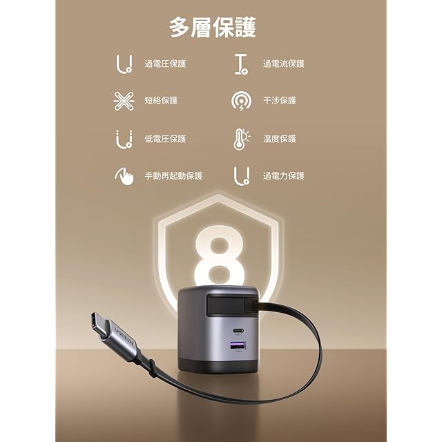▶【長持ちするためのデザイン】UGREEN 65W 伸縮シリーズには進化した GaNFast チップを採用。UGREEN独自の Thermal Guard温度制御技術との組み合わせにより、エネルギー効率を向上、機器本体の発熱量を軽減しました。8 層からなる安全保護機能も備えています。乱雑に扱っても、熱暴走しても、ずっと安心。愛用ガジェットを守りながら、何年も使い続けられる本物の耐久性能です。