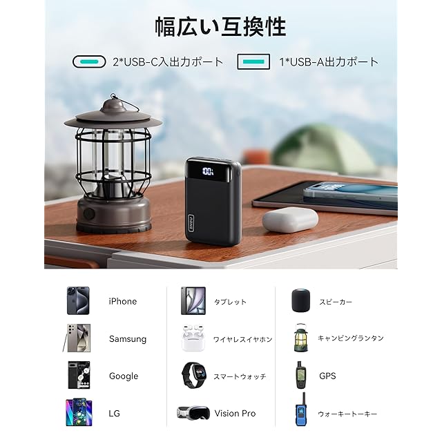 【すべてのデバイスを充電可能】USB-C入力/出力ポート×2、USB-A出力ポート×1を搭載。スマートフォンからGPS、キャンプライトまで、アウトドア機器を広くサポート。低電流デバイス専用モードも対応。