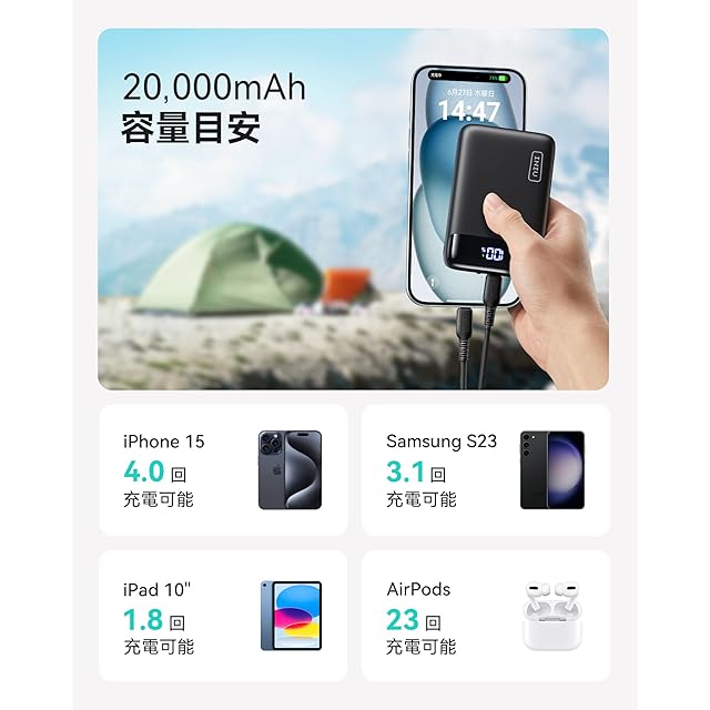 【市場最小サイズ、驚きの大容量】世界最小クラスの20,000mAhモバイルバッテリー。対角わずか1.94インチのコンパクトサイズで、iPhone 15を4回、Galaxy S23を3回充電可能な大容量。