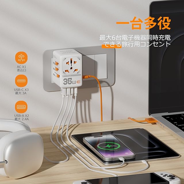 PD 35W急速充電・1台6役:2個USB-A、3個USB-CとACコンセント含めて同時に6つのデバイスを充電できる、毎回たくさん充電器を持ち歩くの面倒だと困っているお方はもう困る必要もなくなります;また、USB-C3は最大35Wの出力を提供し、スマホをわずか30分で0%から50%まで充電可能です(1ポート使用時)。旅行中や出張中のあなたの空港やホテルでの待ち時間を有効に活用できます。