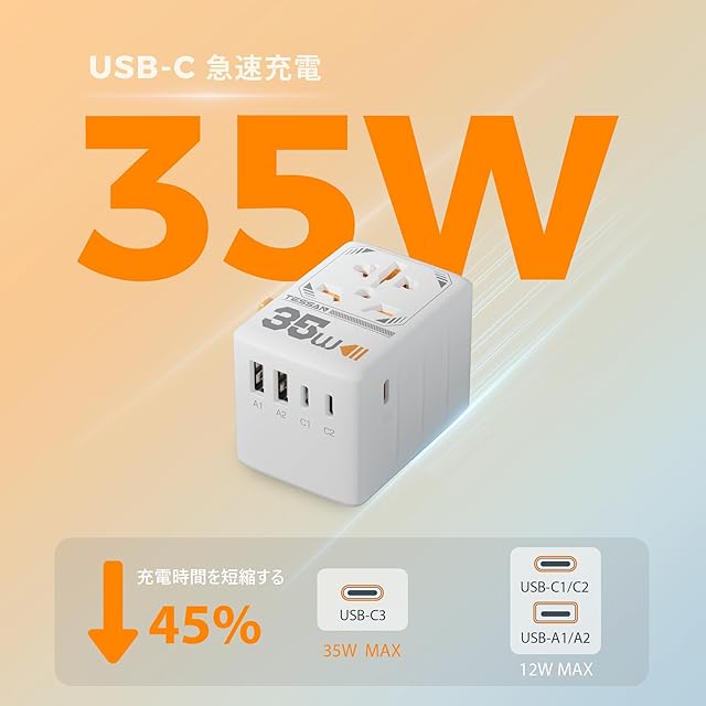 商品名:海外 変換プラグ TESSAN 海外コンセント変換プラグ 海外旅行用/出張用変換プラグ 全世界対応 PD35W 急速充電 コンセント変換アダプター マルチ変換プラグ A/C/BF/Oタイプ 三つUSB-Cポートと二つUSB-Aポート付き 韓国/アメリカ/オーストラリア/ニュージーランド/イギリス/ヨーロッパなどの国に対応