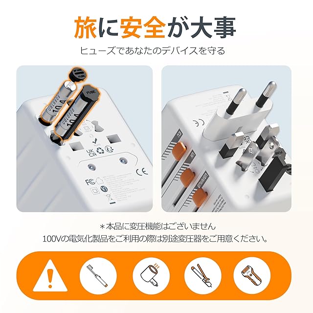 ご注意:本製品は変圧機能がございませんので、日本国内仕様(AC 100V)の電化製品を使用したい場合は、別途変圧器が必要となります。また、ドライヤー、カールアイロンや炊飯器などの高出力の電化製品も変圧器と併用してご使用いただく必要があります、ご使用の際に必ず電圧を確認してください。(ヒューズの最大負荷電流は10Aのため、電圧が110Vの場合でしたら最大電力は110V*10A=1100Wとなります、250Vの場合でしたら250V*10A=2500W以内の電器と対応しております)※本製品は海外での使用を目的として設計されたため、日本国内では使用できません。