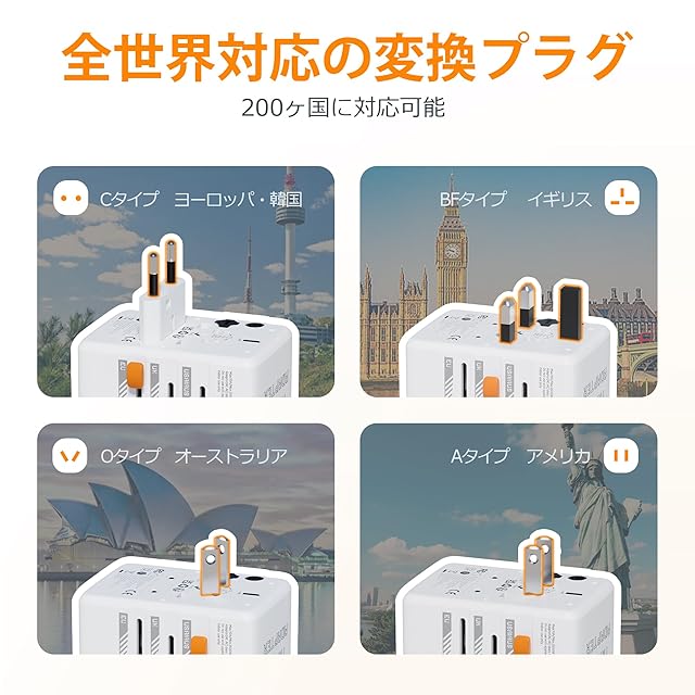 全世界対応の変換プラグ:この変換プラグはA・BF・O・C四種類のプラグに対応するソケットを内蔵しており、アメリカ、ヨーロッパ、イギリス、オーストラリアや韓国など合計200ヶ国以上に使用でする;世界旅行をしたい、もしくは海外出張する方に最適です