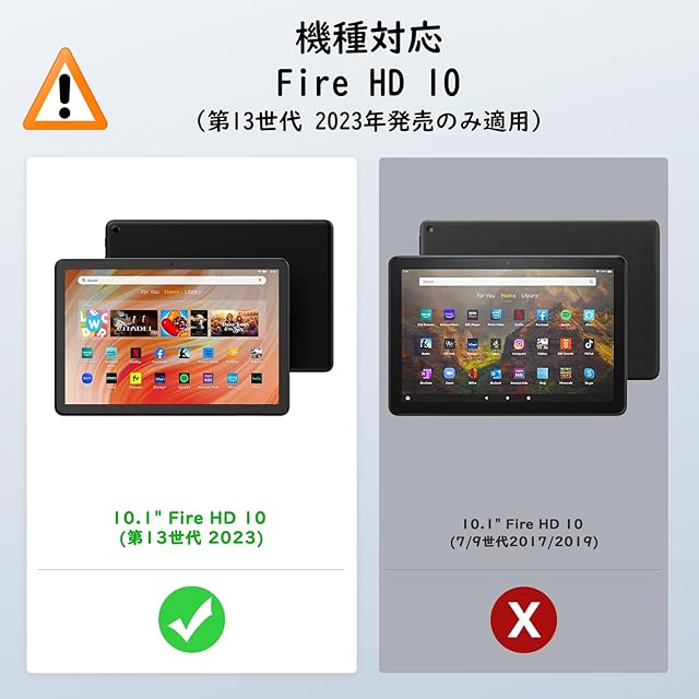 「適用機種」 2023年発売のFire HD 10第13世代新型のみに対応できる手帳式のケースです。薄型かつ軽量化にした設計で、取り扱いやすくFireにピッタリフィットできる見栄えも保護力も両立させたスマートケースです。ご注意:第13世代以外の機種に対応できません。ご購入になる前に、機種をしっかりと確認してください。