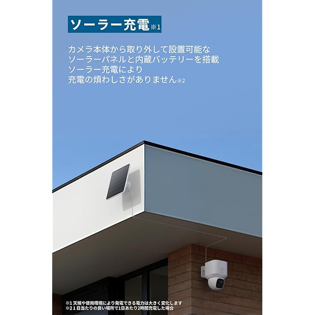 ソーラー充電:カメラ本体から取り外して設置可能なソーラーパネルと内蔵バッテリーを搭載。ソーラー充電により、充電の煩わしさがありません。
