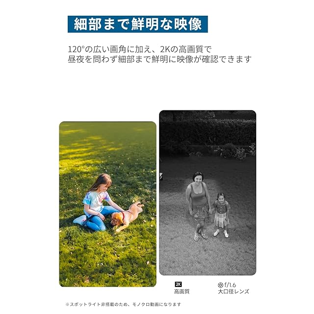 細部まで鮮明な映像:120°の広い画角に加え、2Kの高画質で昼夜を問わず細部まで鮮明に映像が確認できます。