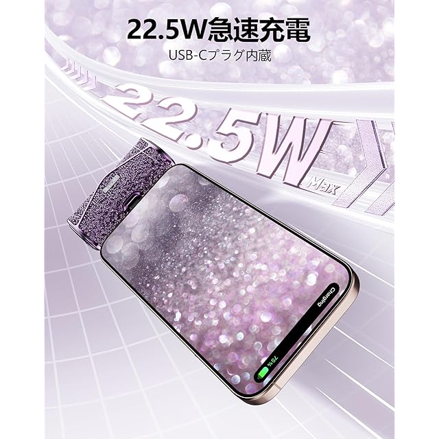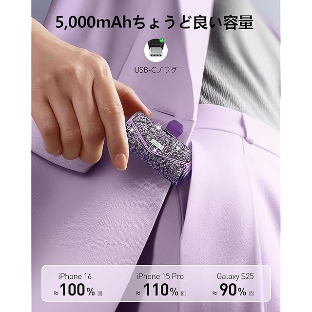 商品名:iWALK モバイルバッテリー おしゃれ 【2025年新登場・きらめく可愛いモバイル充電器・光沢感アップ】 軽量 小型 5000mAh 大容量 タイプc 直挿しできるモバイル バッテリー USB Type-C 端子一体型 コンパクト iPhone 16/15/iPad/Android対応 機内持ち込み可 旅行/出張 PSE認証済み 「ギフトに最適&パーティーにぴったり」 (きらめくパープル)