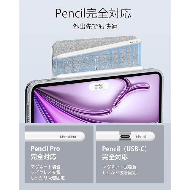 【Pencil Pro&Pencil (USB-C)対応】:Pencil Proへ完全対応かつ、磁気充電用の側面の溝と、Pencilをしっかりと固定するマグネットクラスプを備えています