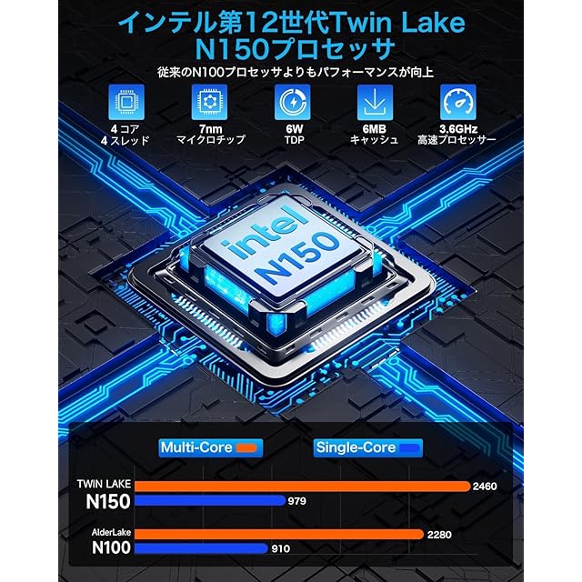 商品名:【ミニpc Intel N150初登場】GMKtecミニpc 最新第12世代インテルTwin Lake-N150 mini pc Windows 11 Pro DDR5 12GB+512G SSD 4コア/4スレッド 7nm 最大周波数3.6GHz WIFI6/BT5.2 TDP 15W 小型 M.2 2242 SATA(PCIe3.0) パソコン RJ45有線LANポート*2 付き