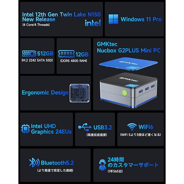 GMKtec ミニpc インテルTwin Lake-N150( 最大3.6GHz)mini pc LPDDR5 12GB+512GB SSD Windows 11 Pro 4コア/4スレッド WIFI6/BT5.2 TDP 6W 小型PC M.2 2242 SATA(PCIe3.0)GMKtec ミニパソコン 2.5G有線LANポート付き 静音性 2画面同時出力 G2 Plus