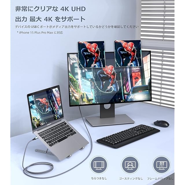 【4K@UHD 解像度出力】Thunderbolt 3で、大画面変換。4K(3840*2160)動画配信やデータ転送ができます。タブレット/ノートパソコンからHDMIデバイスに接続して、4Kの鮮やかな色と鮮明な画像が示される。残像感を大幅に削減し鮮明な映像を楽にご視聴いただけます。下位互換性備え、2K@60Hz、1080p@60Hz、1080I、720p等のHD解像度にも対応しています。何のインストールもなし、接続次第手軽に御利用できます。