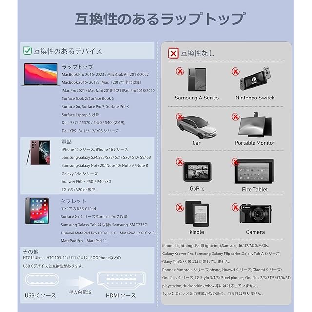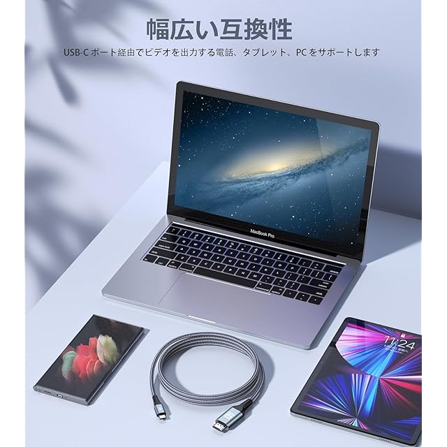 【幅広い機種対応】 対応機器:Samsung Galaxy (S25 S24 S23 S22 S21+/S21/S20+/S20/S10+/S10/S9+/S9) 、iPhone15シリーズ ,アイホン16 シリーズ ,iMac、iPad Pro 2020/2018、MacBook Pro 2022/2021/2020、MacBook Air 2022/2021/2020、Dell XPS 15 シリーズ、Huawei P20 Pro、P30、P40、P50,および DP Alt モードをサポートするUSB C デバイス。(ご注意:Sony Xperia、Samsung、Xiaomi 、Sharp Aquosについて、ほとんど非対応機種となりますので、ぜひお先にお問い合わせください。)amsung は DeXをオンにする必要があり、通常の携帯電話はテレビに接続するために USB デバッグをオンにする必要があります。