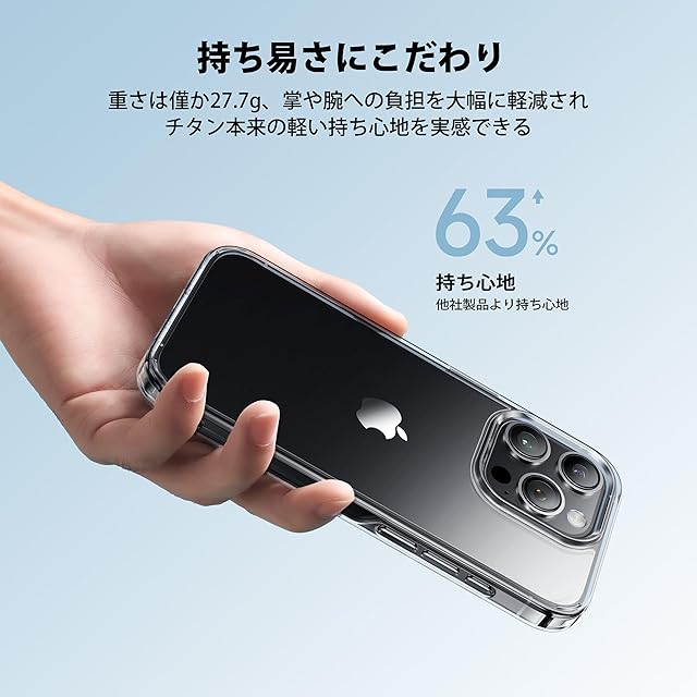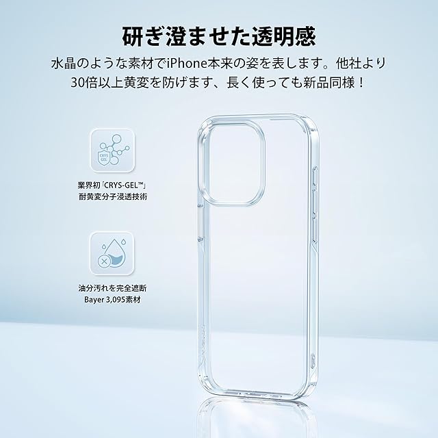 【極々透明感・本体の高級感満喫】高透明度ダイヤPC素材を厳選採用、iPhone15 Pro本来の美しさを損なわなず、高級感を思い存分楽しめる!さらに素材の芯まで最新耐黄変技術「CRYS-GEL」分子を浸透する事でクリアケースのよくある変色劣化を徹底解消