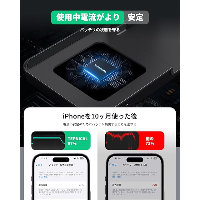 【50%電流転換率アップ、多種保護】iPhone、Sumsung、HUAWEIなど60種類以上のワイヤレス充電対応のスマホモデルをテストし、電流転換が50%アップした場合、同じスマホのモデルでは、T13の充電速度は少なくとも他の充電器より40分速く、最速のモデルは約2.5時間で満たすことができます。同時に、過電圧保護、過電流保護、高温制御及び異物検出機能を搭載し、安全に充電することができます。