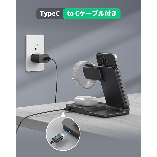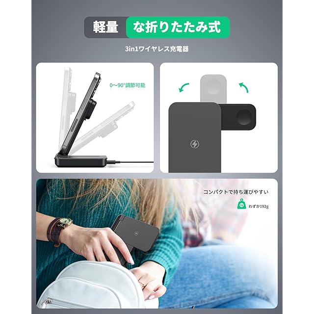商品名:【2025昇進型】TEPNICAL ワイヤレス充電器 3 in 1急速充電 折り畳み式 スタンド 置くだけ 15W/10W/7.5W iPhone 16/15/14/13/12シリーズ対応/Galaxy/Note/Apples iWatch など対応 20W PDアダプター付属 ブラック