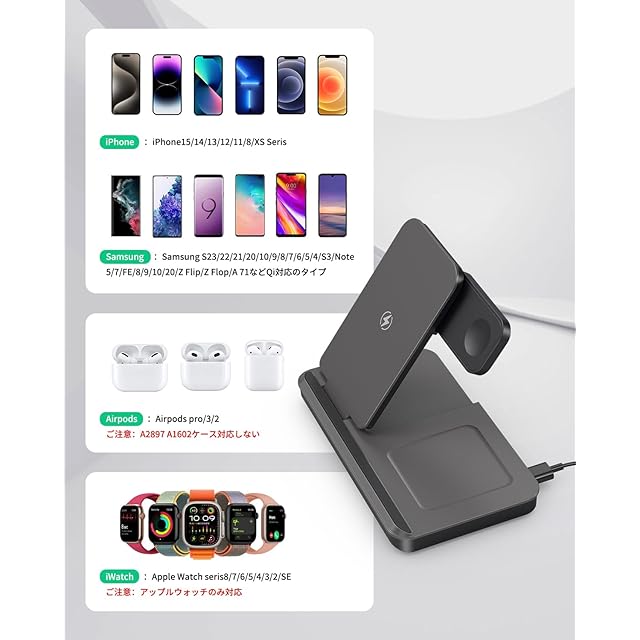 【対応する型番について】スマホ:iPhone16/15/14/13/12/11/X/XS/XR/8/SE/SUMSUNG/HUAWEIなどのワイヤレス充電対応する全ての型番。イヤホン:ワイヤレス充電対応する全てのイヤホン。【ご注意】:airpodsの場合、magsafe充電ケースが対応するが、Lightning充電ケースが対応しない。※ スマートウォッチはiWatchのみ対応。