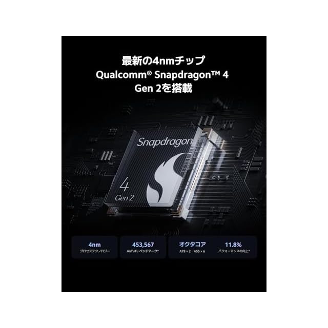 【最新の4nm製造プロセス5Gチップ搭載】最新の4nm製造プロセス5Gチップ、Qualcomm Snapdradon 4 Gen 2を搭載。省電力かつミドルクラス並みの高いパフォーマンスによる快適な操作感、ゲーム体験を提供します。LPDDR4X と UFS 2.2の強力な組み合わせにより、ゲームの読み込み、アプリの起動、画像の読み込みの速度が大幅に向上し、よりスムーズな操作性を可能にします。
