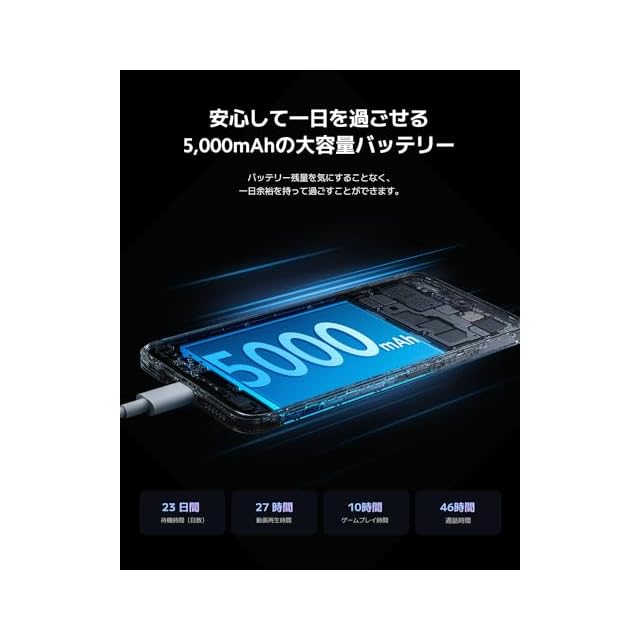 【安心して一日を過ごせる5000mAhの大容量バッテリー】5,000mAh大容量バッテリーを搭載することで、動画再生時間は27時間、通話時間は46時間、ゲームプレイは10時間。バッテリー残量を気にすることなく、思う存分動画を視聴したり、ゲームを楽しんだり、一日余裕を持って過ごすことができます。