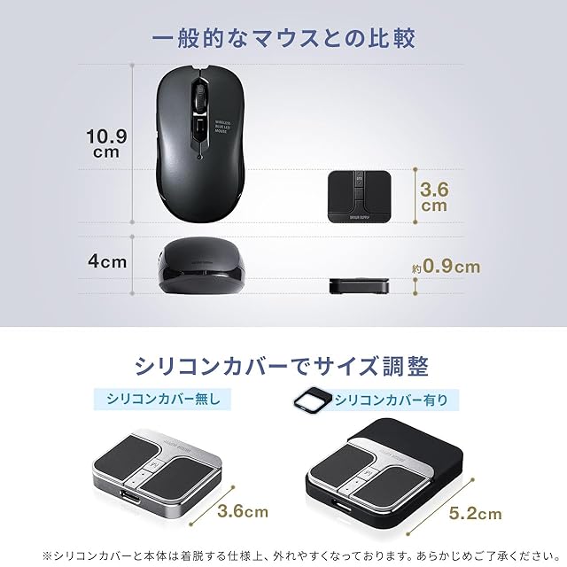 付属のシリコンカバーでサイズを調整することができます。シリコンカバーには USB A レシーバー を収納できます。左右クリック、スクロール(マジックホイール) ボタン を搭載した標準の 3ボタン 仕様です。