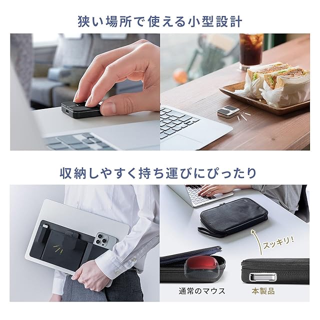 超 薄型 の持ち運びに便利な 小型 ワイヤレスマウス です。 コンパクト ×薄型で持ち運び&収納しやすく、狭い場所でも使いやすいです。
