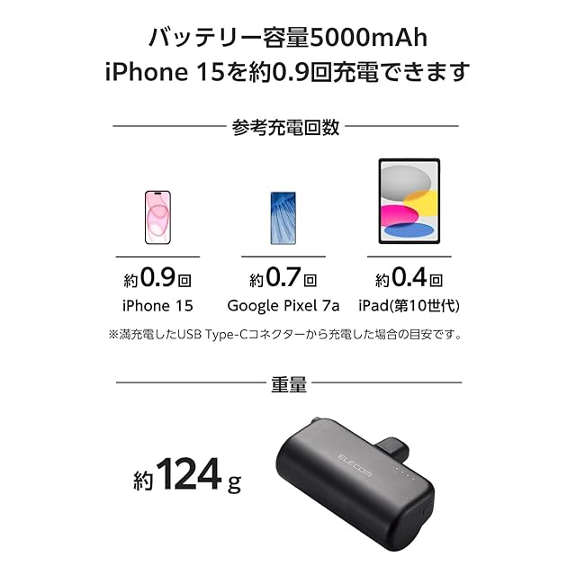 容量は5000mAh。iPhone 15を約0.9回、Google Pixel 7aを約0.7回充電できます。