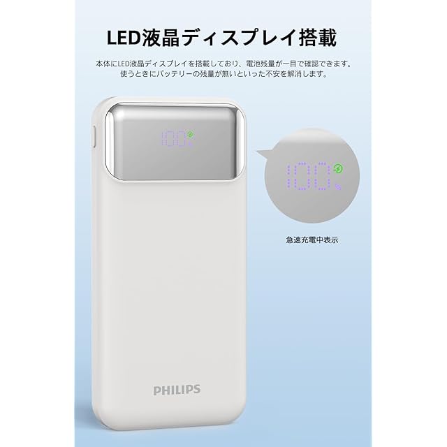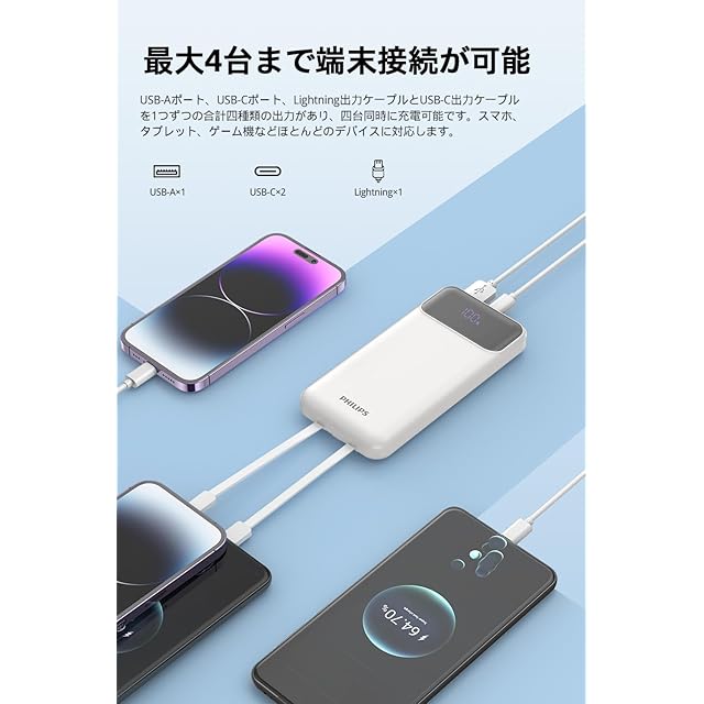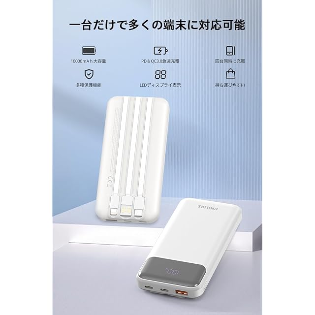 商品名:Philips (フィリップス) モバイルバッテリー 10000mAh大容量 ケーブル内蔵 PD&QC急速充電 四台同時充電 LED電量表示 スマホ充電器 PSE認証済 多種保護 持ち運びやすい DLP1912CW