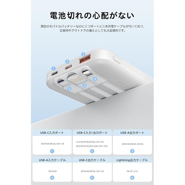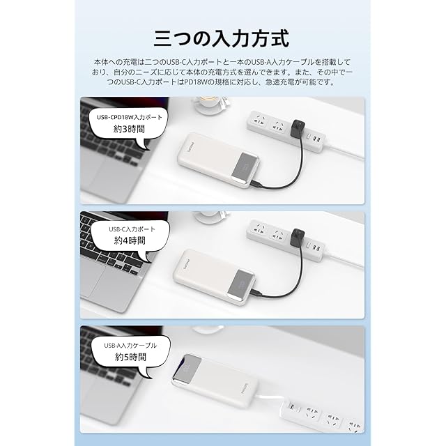 四台同時充電・三つの入力方式:本モバイルバッテリーはUSB-Cポート・USB-Aポート・USB-Cケーブル・Lightningケーブルをそれぞれ1つずつ搭載しており、スマホやタブレットなどのデバイスを四台同時に充電可能です。複数デバイスを持ちしている人には大変便利です。また、二つのUSB-C入力ポートと一本のUSB-A入力ケ一プルを搭載しており、どちらからでも本体へ充電可能です。場所や自分のニーズによって入力方式を選んできます。