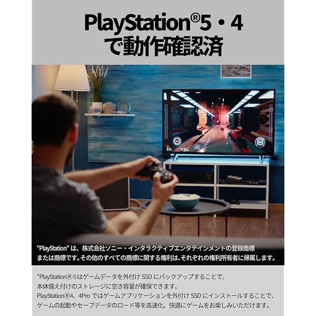 ✅【PlayStation 5、PlayStation 4に使えます】 PlayStation 5、4、4Proでの動作確認をしています。 PlayStation 5 はゲームデータを外付けSSDにバックアップすることで、本体備え付けのストレージに空き容量が確保できます。 PlayStation 4、4Proではゲームアプリケーションを外付けSSDにインストールすることで、ゲームの起動やセーブデータのロード等を高速化。快適にゲームをお楽しみいただけます。