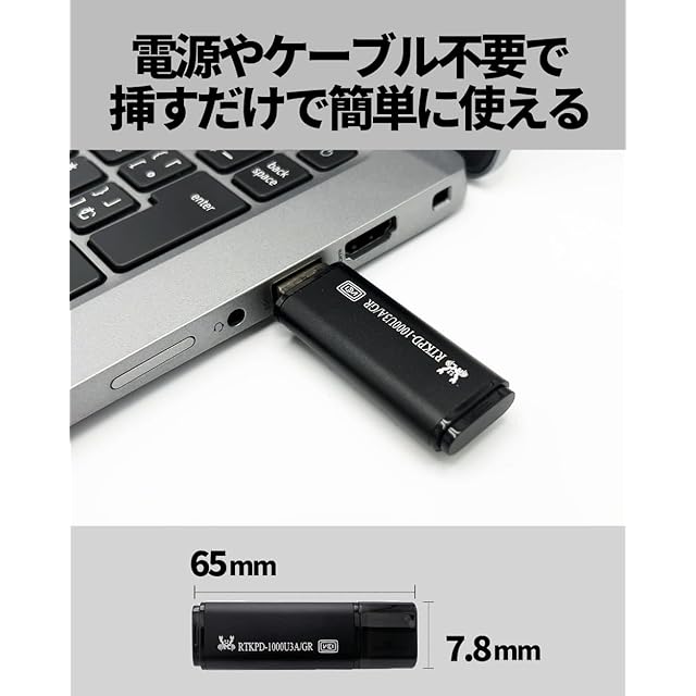 Realtek RTKPDシリーズ USB接続 外付けSSD USBメモリサイズの小型&軽量な外付けのポータブルSSDです。 シンプルでトラディショナルなデザイン。USB3.2(Gen1)をサポートし、最大読み込み速度は450MB/秒です。 キャップ式で、USBコネクターへのごみやほこりの侵入を防ぎます。