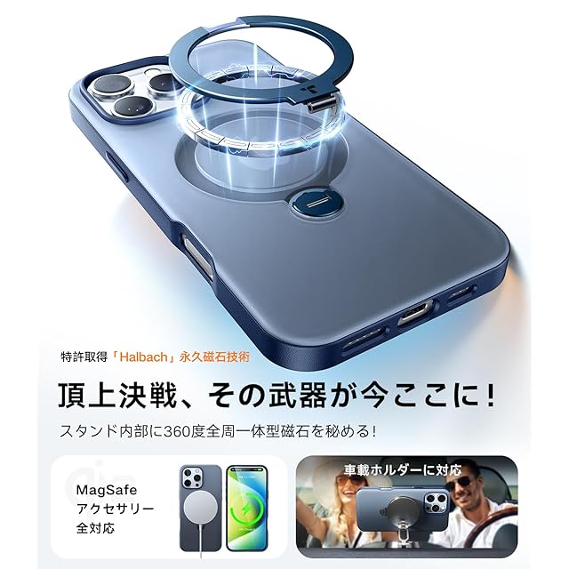 商品名:TORRAS iPhone 16 Pro 用 ケース【洗練ネイビーマット|360° ゼンマイ式スタンド × 10 万回開閉耐久】米軍規格 縦横両対応 リング付き マグネット搭載 ワイヤレス充電対応 耐衝撃 防指紋 半透明 Ostand Spin ネイビーブルー
