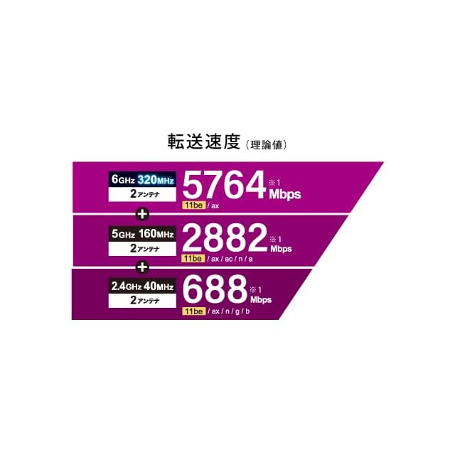 【最新規格Wi-Fi 7】6GHz/5GHz/2.4GHzの3つの帯域すべてがWi-Fi 7に対応した、トライバンドWi-Fi 7ルーターです。 【MLO&320MHz幅通信】3つの帯域を同時に利用できるMLOと、6GHz 320MHz幅通信に対応。Wi-Fi 7ならではの高速通信を実現します。※端末側も対応している必要があります。 【可変外付けアンテナ】独自設計の外付けアンテナを採用。ご利用環境に合わせてアンテナを調整することで、広範囲を安定したWi-Fiでカバーできます。 【10G回線を活用】10Gbps通信に対応したINTERNETポートを搭載し、回線速度を活かした高速Wi-Fi環境の構築をサポートします。※INTERNETポートのみ10Gbps対応 【EasyMesh対応】お持ちのEasyMesh対応ルーターと組み合わせてメッシュWi-Fiをお使いいただけます。本機を2台組み合わせれば、Wi-Fi 7メッシュ環境の構築も可能です。